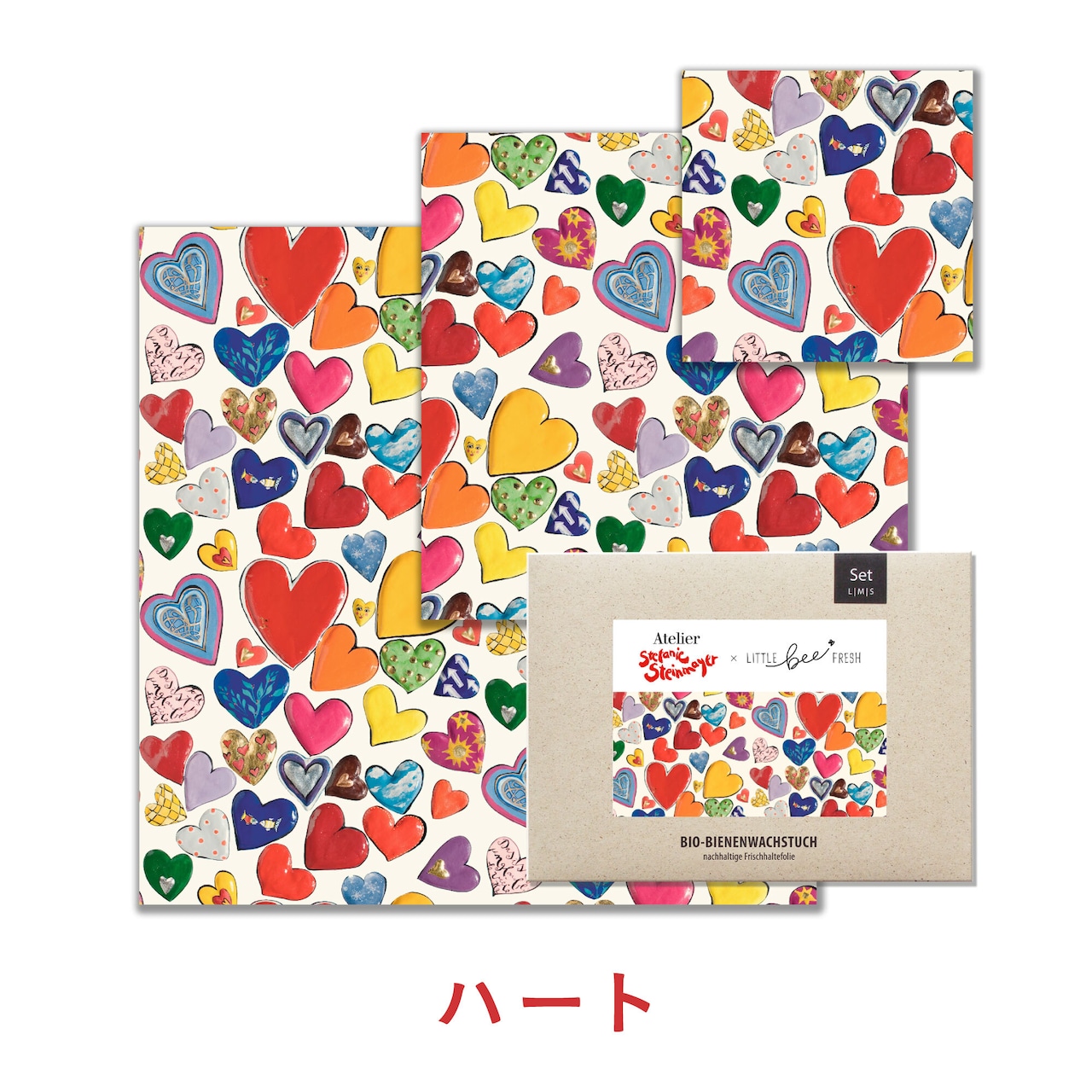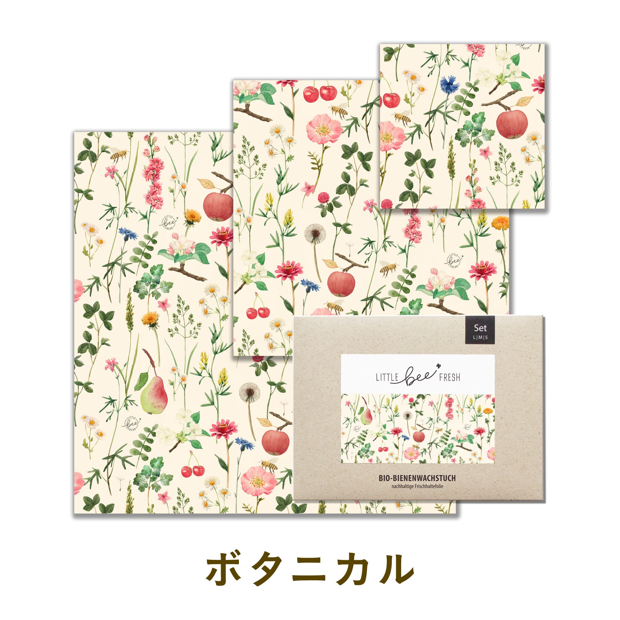 毎日の食材保存に役立つ「みつろうラップ S・M・Lサイズ」と、パンや果物、野菜、焼き菓子などの持ち運びに便利な「みつろうバッグ」を組み合わせた、Little Bee Fresh の定番アイテムを一度に楽しめるセットです。